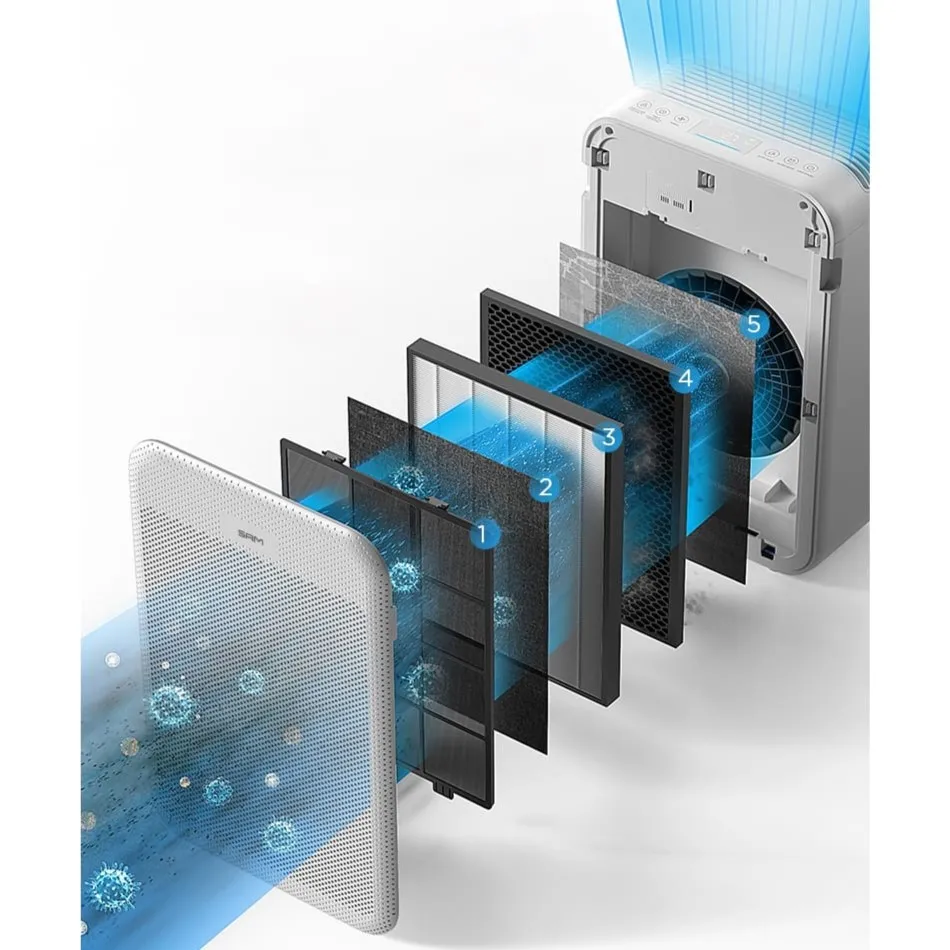 تصفیه هوا خانگی سام مدل AP43 با سیستم فیلتراسیون پنج مرحله ای کار میکند، فیلتر اولیه برای گرفتن ذرات درشت مثل گردوغبار و مو، فیلتر آنتی باکتریال که جلوی رشد باکتری ها را میگیرد، فیلتر هپا 13 (HEPA 13) برای جذب ذرات خیلی ریز تا اندازه 0.3 میکرون، فیلتر کربن فعال که بوهای نامطبوع، گازهای شیمیایی و دود را خنثی میکند، و فیلتر گردوغبار که لایه حفاظتی نهایی را تشکیل میدهد. این ترکیب لایه به لایه باعث شده هوای خروجی واقعاً تمیز و تازه باشد و اثری از آلودگی هوا باقی نماند.