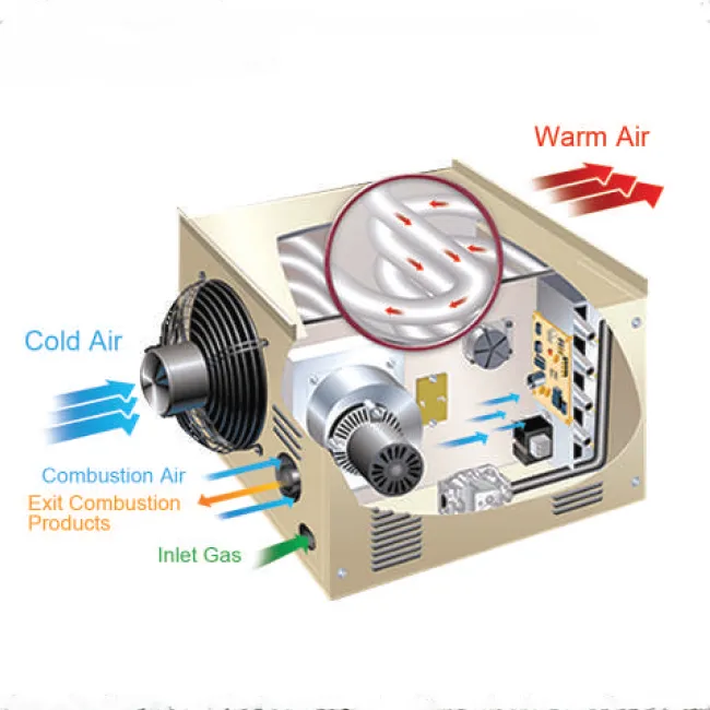 فن قدرتمند دستگاه، هوای گرم را به صورت یکنواخت در فضاهای بزرگ مانند سالنهای صنعتی، انبارها، گلخانهها و مرغداریها پخش میکند. این ساختار لولهای، علاوه بر راندمان حرارتی بالا، عمر مفید طولانی و قابلیت تعمیر آسان را فراهم میآورد، زیرا رسوبات داخل لولهها به سادگی قابل اسیدشویی هستند.